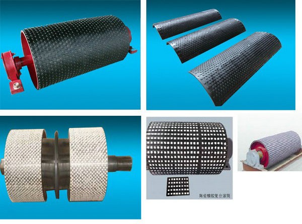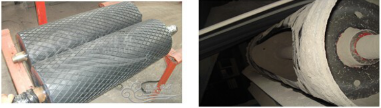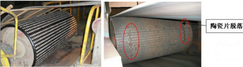 二、采用粘貼或硫化陶瓷片的方法來(lái)增加滾筒的耐磨性能(皮帶張力與滾筒表面摩擦力會(huì)形成一個(gè)強(qiáng)大的剝離力,該剝離力很容易將陶瓷片從橡膠上撕下來(lái),實(shí)際使用壽命不長(zhǎng),也需要反復(fù)包膠)